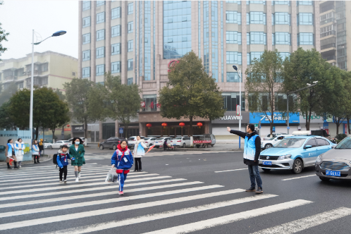 30余名志愿者身着“蓝马甲”来到天岳大道与书院路交叉口、天岳大道与兴旺东路路口,指导车辆有序通过,护送过往学生。