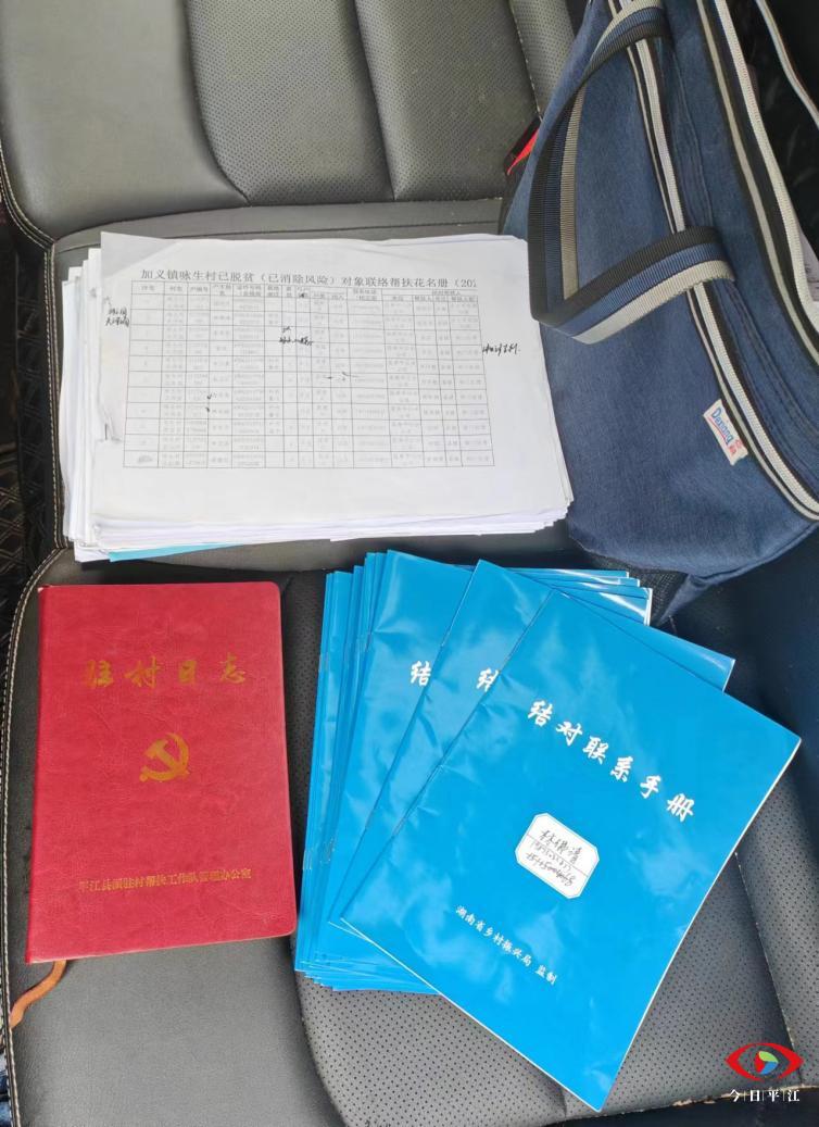 驾驶室内,悬挂的工作证格外显眼。后座上,放着他工作的手提布包,包内则是他驻村结对帮扶工作文件、结对联系手册、驻村日志。