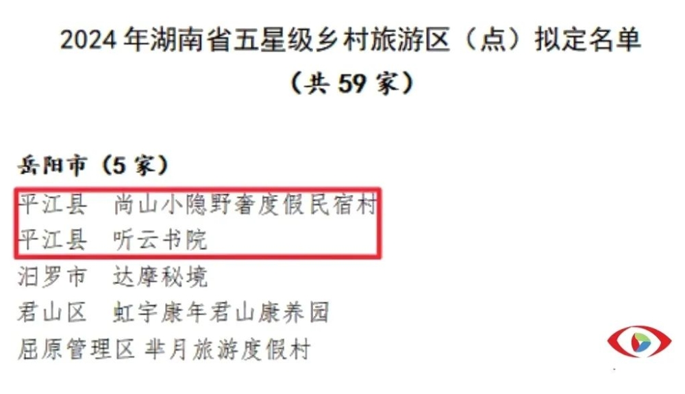 近日,湖南省乡村旅游区(点)星级评定委员会发布《关于2024年湖南省五星级乡村旅游区(点)创评结果的通报》,授予59家单位“湖南省五星级乡村旅游区(点)”称号,其中,平江2家上榜。