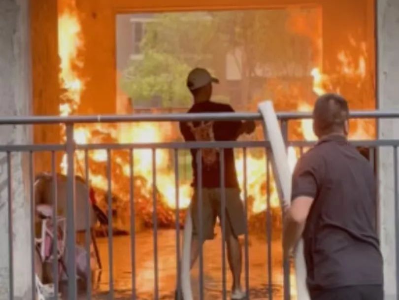 情况危急,黄神舟捂住口鼻,迅速跑到楼道找到消防栓。在浓烟和高温的包围下,他艰难地打开消防栓,拿起水管,对准着火点猛冲过去。然而,火势太猛,水流仿佛被火焰吞噬,此举效果微弱。他当机立断,纵身越过围栏,手持水管,对着火势最大的部位猛冲猛打。