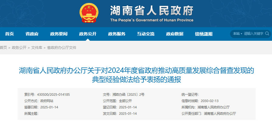 据了解,2024年12月中旬,省政府派出7个督查组分赴14个市州开展了实地督查。为表扬先进、宣传典型,进一步推动形成真抓实干、创先争优的良好局面,经省人民政府同意,湖南省人民政府办公厅对2024年度省政府推动高质量发展综合督查发现的70项具有代表性、典型性的典型经验做法予以通报表扬。