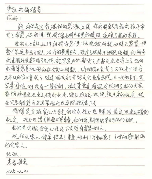 近日,27岁的平江小伙潘子超收到了一封特殊的感谢信,写信者是一位16岁白血病患者的母亲。手写的字迹将信纸写得满满当当,字里行间,满是真诚的致谢。