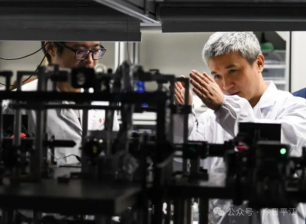 在位于安徽合肥的中国科学技术大学,彭承志(右)在实验室与学生交流实验进展。图源:新华社。