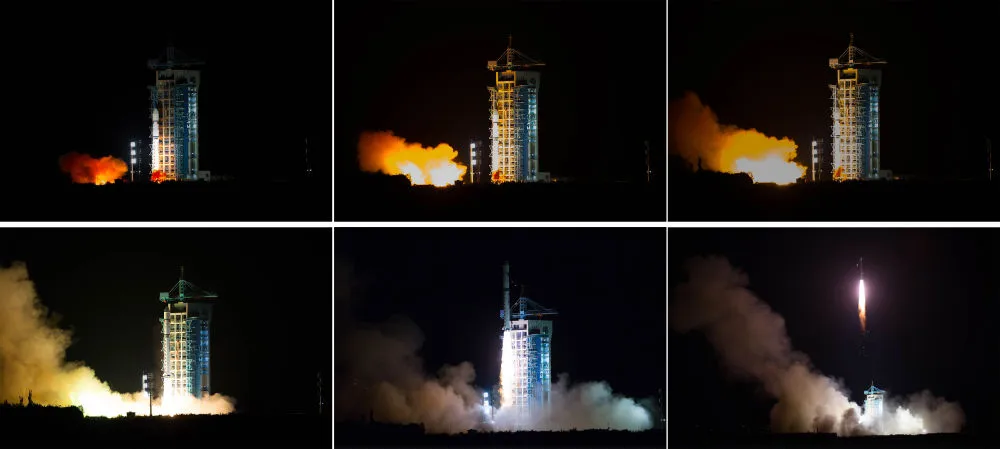 2016年8月16日1时40分,我国在酒泉卫星发射中心用长征二号丁运载火箭成功将世界首颗量子科学实验卫星发射升空(拼版照片)。图源:新华社