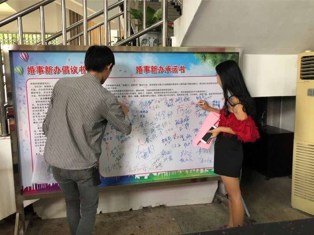 在工作人员和志愿者的引导帮助下,经过免费照相、填表登记、颁证宣誓、签订婚事新办承诺书等环节,一对对新人在最满意的时间就领到了结婚证。刚刚拿到“红本本”的陈先生兴奋地向笔者表示,他们特意挑选了这个日子,就怕排不上号,虽然之前在网上进行了预约,但看到现场这么多人的时候,心里还是没底,没想到民政局的工作人员为大家考虑的这么周全,不到10分钟就办好了所有手续,太感谢他们的默默付出了,自己一定会当婚事简办、新办的倡导者和践行者,发扬节俭朴素的优良传统,举办一场“简约而不简单、浪漫而不浪费、时尚而不奢侈”的婚礼来回报他们。其他新人们也纷纷表示自己的婚礼都会自觉抵制大操大办、铺张浪费,自觉摒弃婚俗陋习,坚决用健康文明的新方式替代旧习俗,努力为形成良好社会新风尚贡献力量。(李淼源 姚亮)