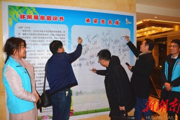 平江是人口大县和劳务输出大县,约有40万乡友在全国各地经商务工。春节来临,该县专门下发了《关于积极倡导寓外乡友带头做好文明节俭工作的通知》,把文明节俭工作列入各乡镇乡友会、新春茶花会的重要议题,向广大乡友发出“婚事新办、丧事简办、其他事项不办”的倡议,广泛宣传文明节俭工作“六提倡六反对”,同时,动员和鼓励知名乡友加入各村红白理事会,共同推进文明节俭工作。