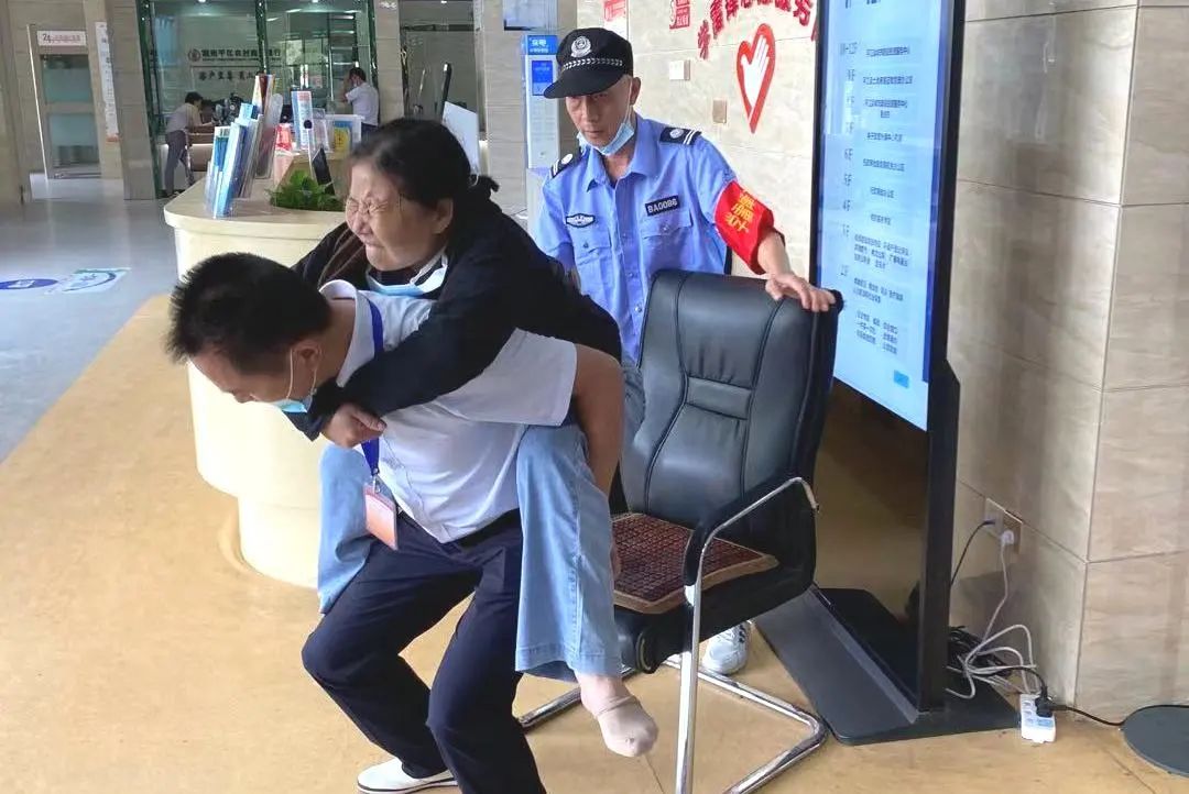 这是在县政务服务中心,一位前来办理社保的老奶奶下楼时崴了脚,疼痛难忍,她一个人坐在台阶上,又没带手机,正无计可施时,工作人员陈林看到后,立刻背起老奶奶到大厅坐下,同事池柳也急忙赶过来了,给老奶奶倒杯热水,打电话告知家属。不一会儿,老奶奶的女婿来了,对大家满口感谢。