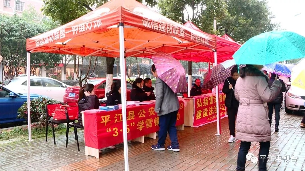 这是在书院社区,学雷锋活动正开展得有声有色。当天,尽管雨下得很大,但来自公安局、卫计局、“大爱平江”的志愿者早早地就来到活动现场,为过往的群众分发宣传单,给他们量血压、测血糖。耐心的志愿者还为群众讲述防诈骗、日常保健和法律法规等知识。
