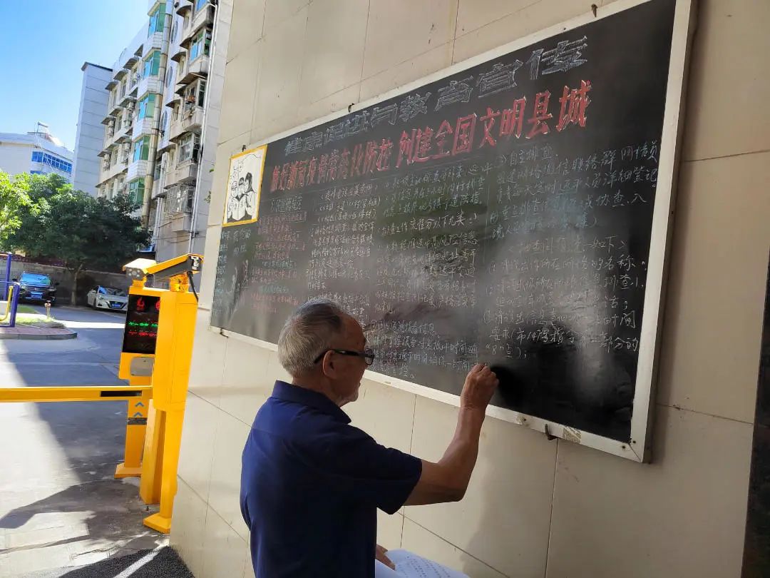 "当然认识了,我们小区有一道亮丽的风景线——黑板报,你关心的、你想看的,老爷子都知道"。