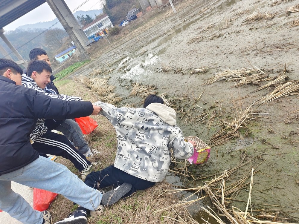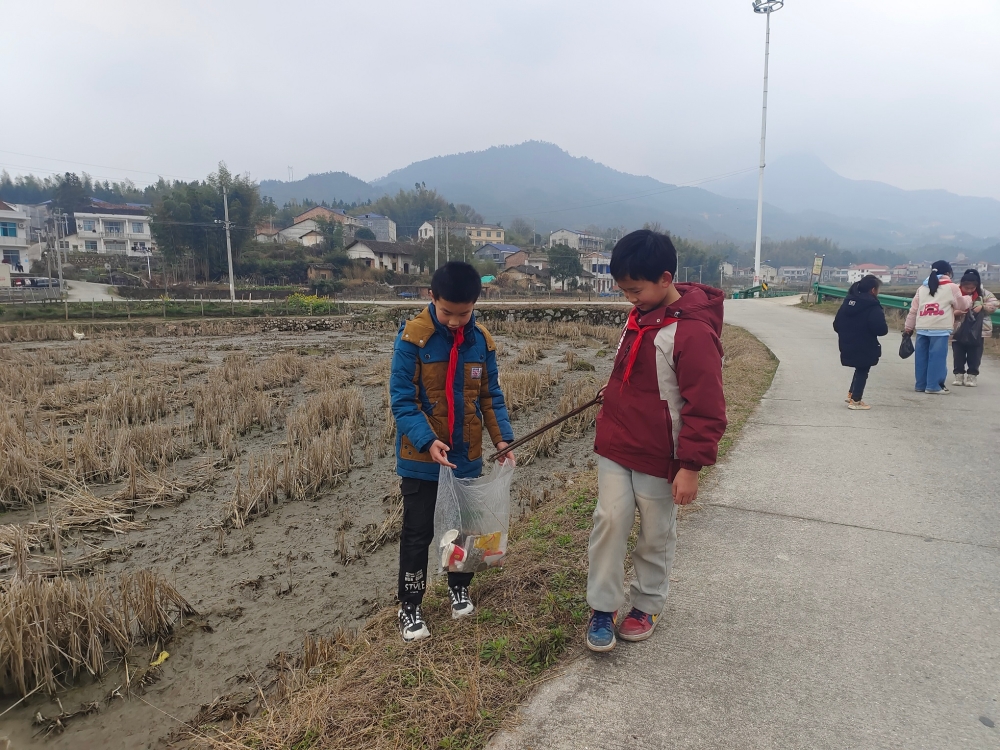 到了柘庄加油站的附近,三个红领巾女生被路边水坑里的树叶和纸团吸引了注意力。她们马上行动起来,两个人分别拿着铁钳,另一个人张开了塑料袋,很快,树叶和纸团就被清理完毕。另外一条路上,八年级174班的陈浩宇要同学拉住自己的手,将路边田里的一只矿泉水瓶捡了上来;173班的曾梓龙见状,也寻求到同伴们帮助,不甘示弱地把田里更远的一个烟花筒捡了上来。孩子们不怕苦不怕累不怕脏,脸上露出开心的笑容。就这样,不到一个小时的时间,柘庄村周边环境变得干干净净,附近的居民和过往的行人对着大小“雷锋”们竖起了大拇指。