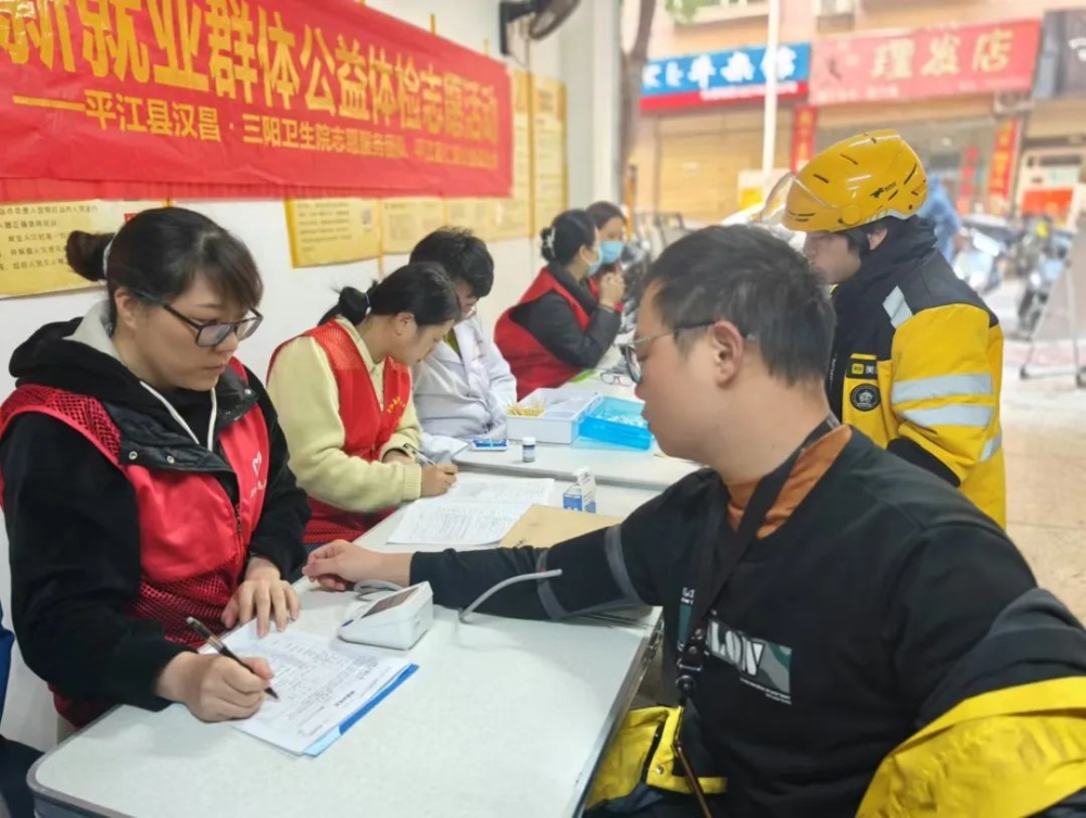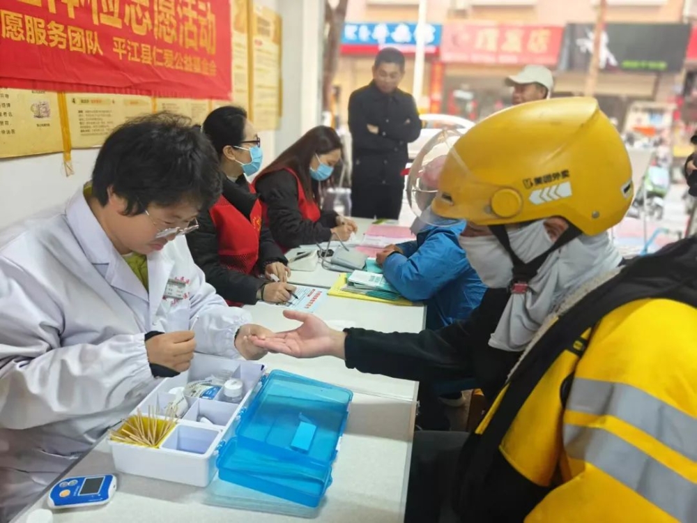 12月2日,平江县汉昌·三阳卫生院医疗志愿服务团队连同平江县仁爱公益基金会志愿者深入美团外卖平江站开展关爱新就业群体公益体检活动,近200名美团外卖网约配送员参与体检。