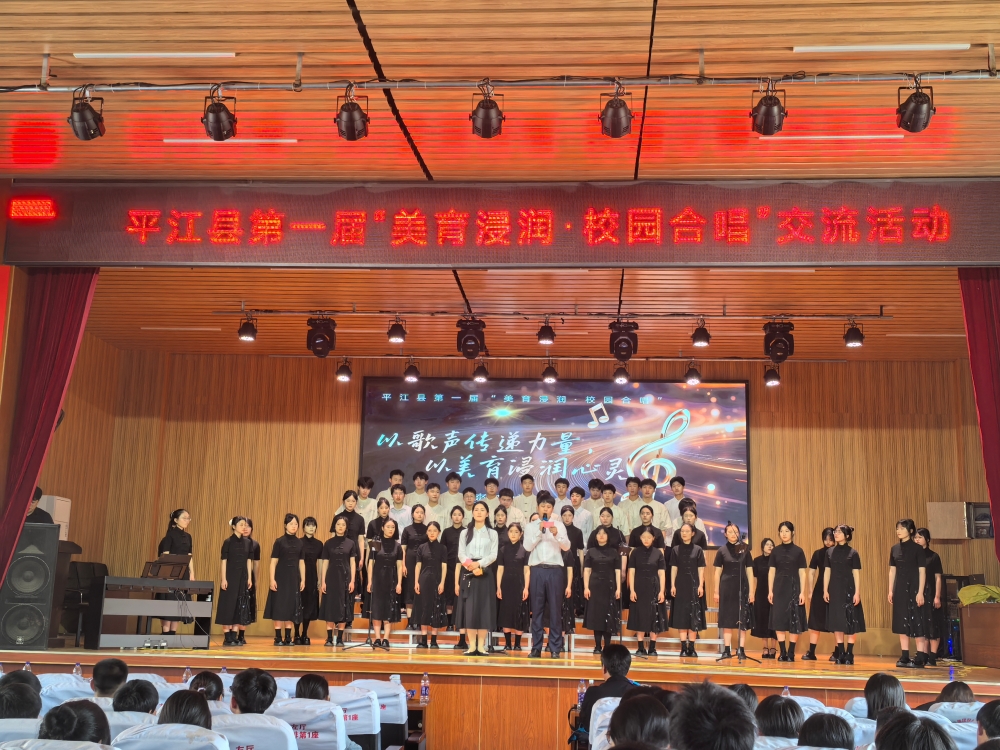 4月9日,三市镇爽口中学大礼堂,该校700多名师生齐聚于此,听取由县教育合唱团和平江职校学生合唱团带来的合唱。作为平江县第一届“美育浸润·校园合唱”活动的第一站,正如爽口中学教师李日明在《听教育合唱团下乡表演》中所写一样,“阵阵悦耳串串圆润玉珠飘荡在大厅,灵动指挥着音符,美育的天空湛蓝透亮,发丝中沉浸着情思。幽静的春月缓缓升起,江水激起一圈圈涟漪,承载着屈子求索忧思,传递力量美的种子开始萌芽”,全体师生沉醉在美妙的音乐中无法自拔,美育正悄悄浸润他们的心灵。