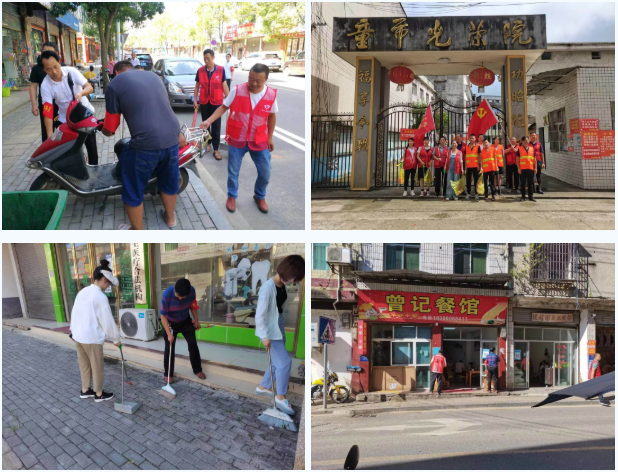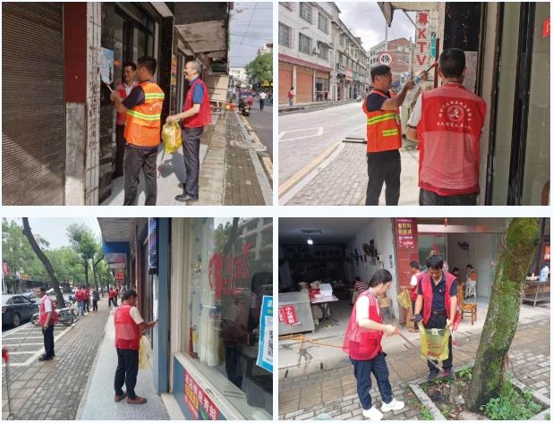 活动期间,各实践站充分发挥新时代文明实践志愿服务带动作用,组织广大党员、志愿者、群众共同参与到人居环境整治中,通过向沿街商户、群众发放宣传资料,耐心解答群众疑问,做好文明宣传员,引导群众加入到参与文明创建的行动中,提升群众对农村环境整治和文明创建的参与感和责任感。除了宣传发动,由各实践站组成的创文"小分队",还对集镇十字街沿线、农贸市场、河道等公共场所进行全面清理。烈日当空,但志愿者们不畏酷暑,个个干劲十足,大家分工明确,或拿着垃圾袋,捡拾地上烟头;或拿着小铲子,清理路灯和电线杆上的"牛皮癣"和小广告;或劝导督促商户落实"门前三包"责任,清理店前杂物;或帮着交警一同拆除加装的晴雨伞;或劝导车辆有序摆放、行人过马路走斑马线......村头巷尾都是志愿者们忙碌的身影。
