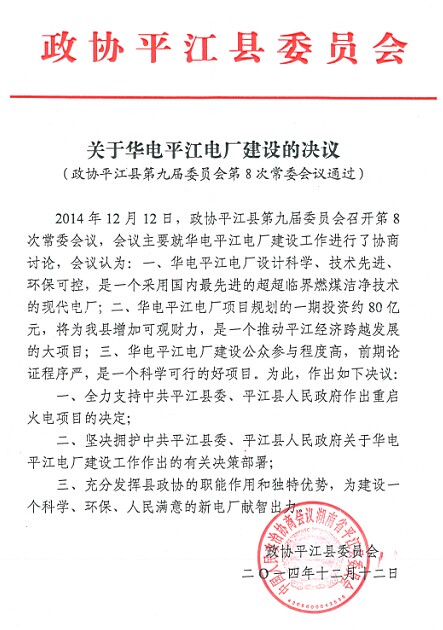 参加会议的常委有36名,全体通过了《关于华电平江电厂建设的决议》(全文附后)。