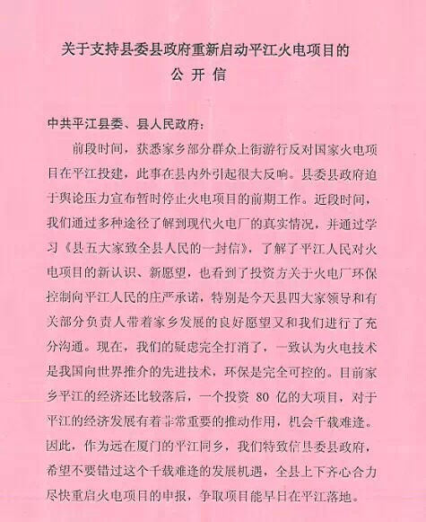 关于支持县委、县政府重新启动平江火电项目的公开信