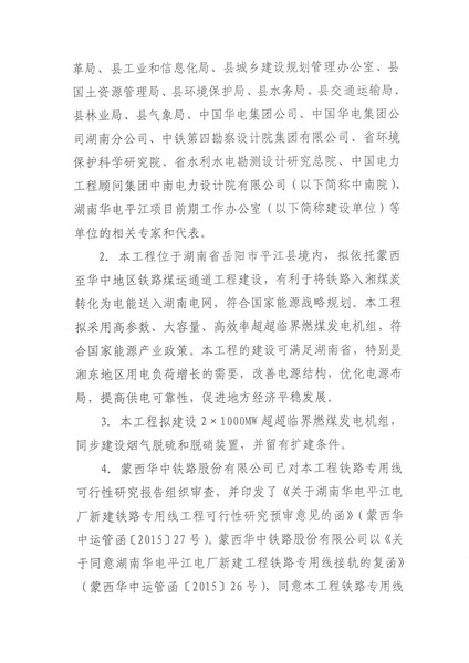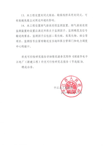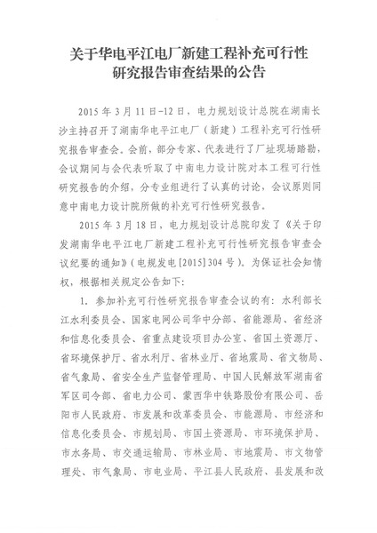 关于华电平江电厂新建工程补充可行性研究报告审查结果的公告