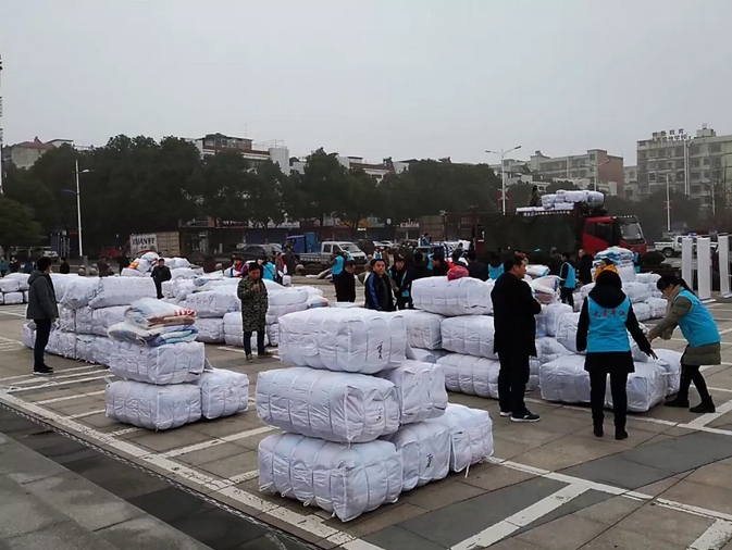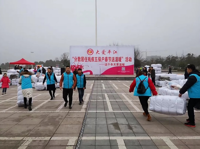 1月13日,由“大爱平江”扶贫助困慈善协会(基金会)举办的“大爱平江”分散居住残疾五保户春节送温暖活动在天岳广场启动。1400余套床上用品分发到各乡镇分管负责人手中,由他们送到每一户分散居住的残疾五保户家中,帮助他们温暖过春节。