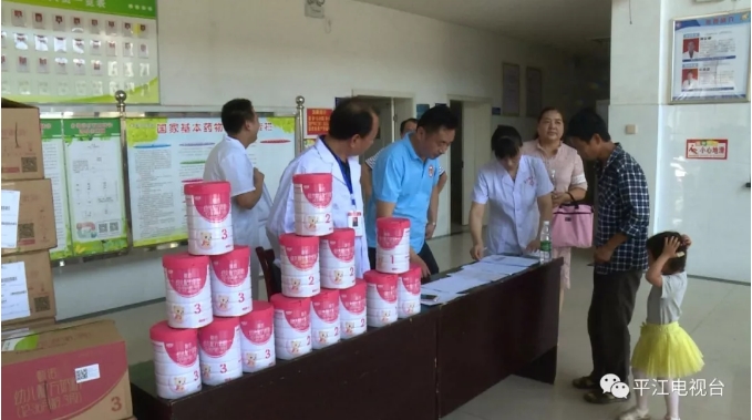 7月3日,“大爱平江”工作人员来到瓮江镇开展国奶扶贫工程活动。