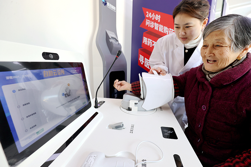 在浙江省湖州市德清县阜溪街道兴山未来社区居家养老服务中心,家庭医生辅助社区老人进行云问诊(2023年2月16日摄)。新华社发(谢尚国 摄)