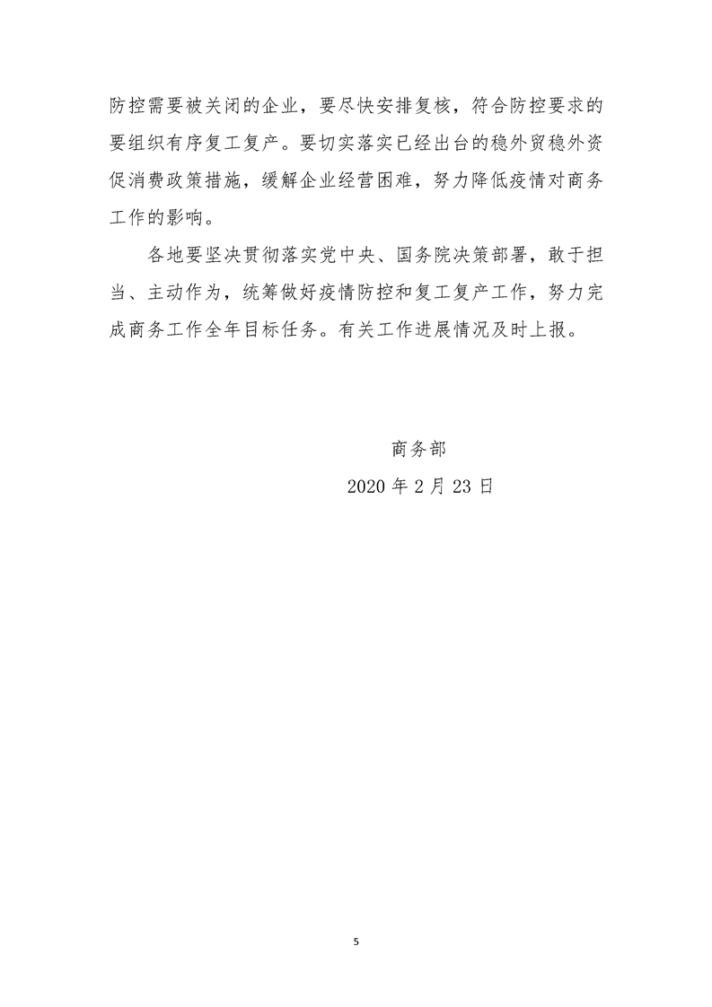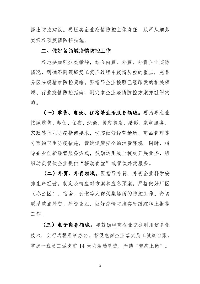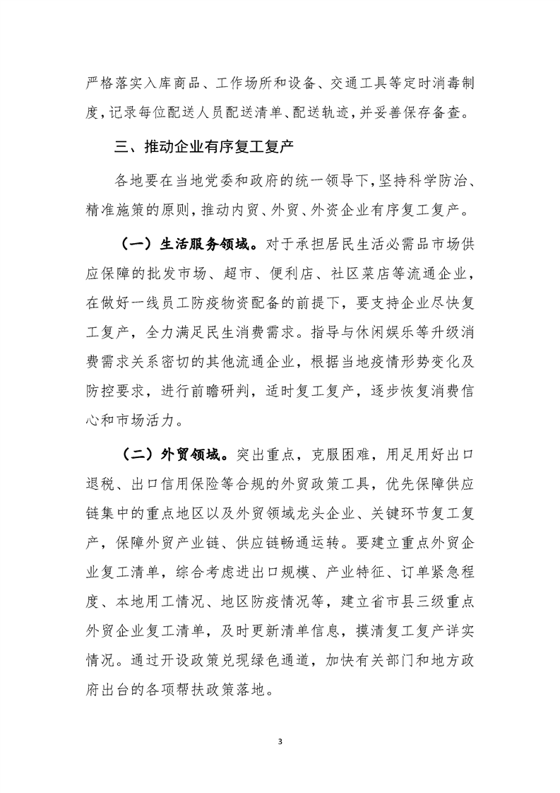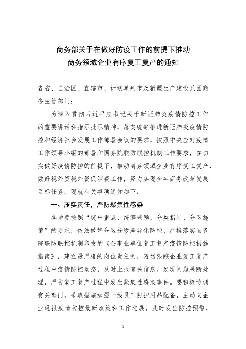 关于在做好防疫工作的前提下推动商务领域企业有序复工复产的通知