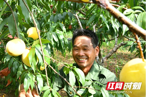 刘春连是这片黄桃园的种植户,2016年,他还是该村的一名贫困户,看到后山荒山闲置实在可惜,于是有了从事种植黄桃的念头,在当地党委政府和扶贫工作队的帮助下,流转200多亩荒山种植黄桃和油茶树,吸纳建档立卡贫困户就近就业,参与果园管护。