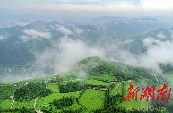 (6月30日,安化县马路镇云台山顶,标准化的生态茶园与远山、云海、绿树相互映衬。目前,茶产业已成为该县脱贫攻坚的重要支柱产业。 湖南日报·新湖南客户端记者 李健 摄)