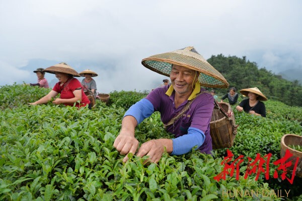 ( 6月30日,安化云台山八角茶叶有限公司种植基地,村民在采摘茶叶。目前,茶产业已成为该县脱贫攻坚的重要支柱产业。湖南日报·新湖南客户端记者 李健 摄)