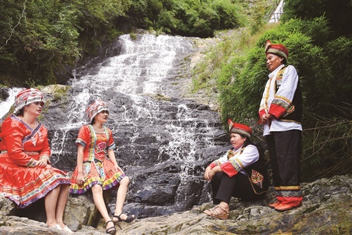 8月17日,溆浦县小横垅乡罗子山村白水瀑布群下,瑶家阿哥阿妹对唱山歌。湖南日报记者 徐行 摄