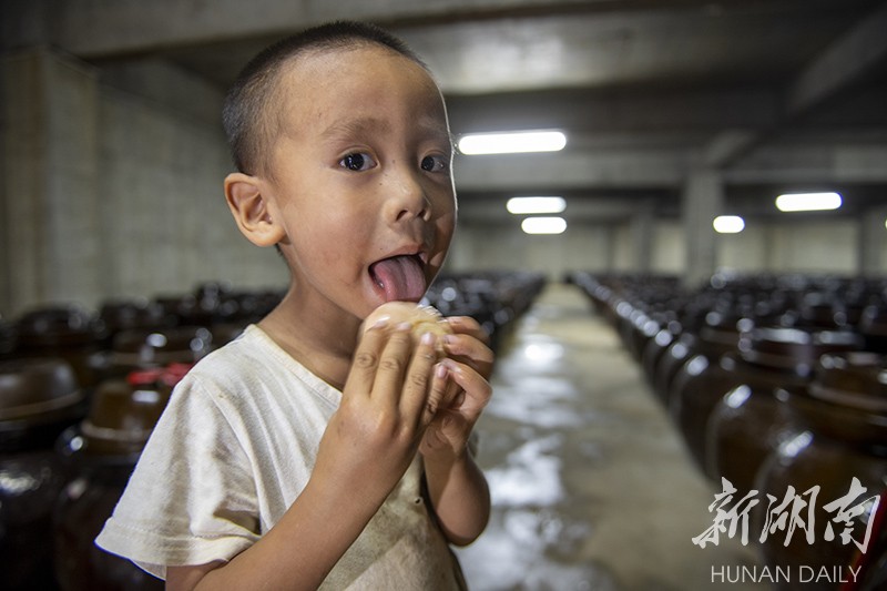 (8月21日,永州市冷水滩区麦子园村,小孩子舔吃陶土坛里腌制出来的大蒜。 湖南日报·华声在线记者 辜鹏博 摄)