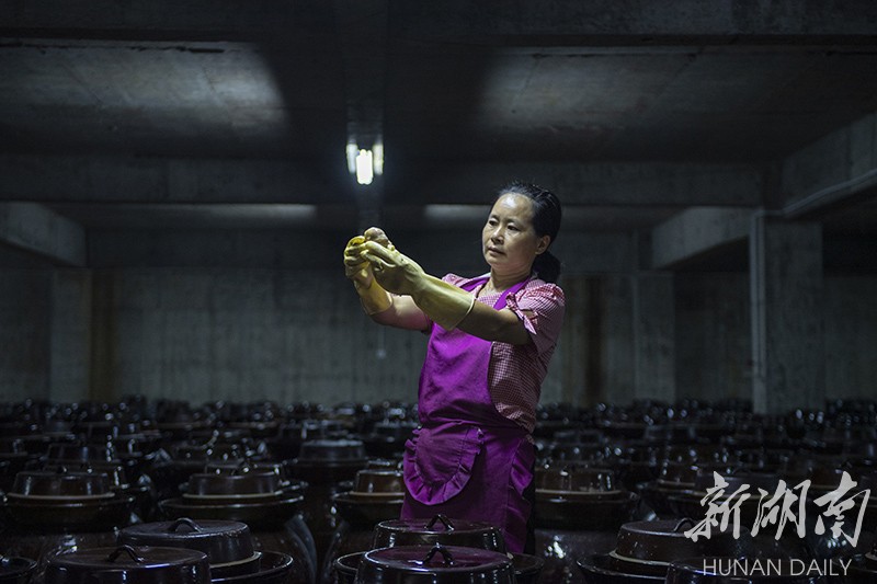 必备的是一口肚大颈细陶土坛,摆放在四季恒温地下室,将洗净晾干后的新鲜辣椒填满坛体,插入4条竹篾,呈井字型压实,哗啦啦倒入按比例调配好的米酒和盐水,再在坛沿处倒水,盖上坛盖密封,这算是完成了第一步。