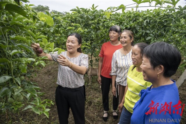 有了地,妇女能干什么?蒋素梅大胆尝试,带领几户村民种百香果,并成立专业合作社。没有技术,先去广西、怀化等地学习,回来再手把手教大家。蒋素梅到外地经常分不清方向,转得头晕,传授起种植技术来,却拎得门清。