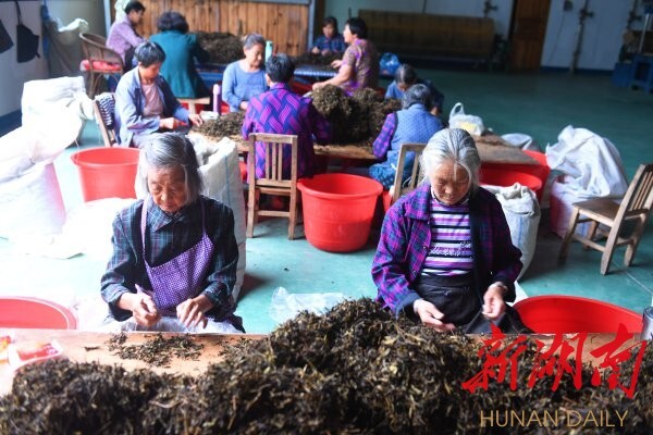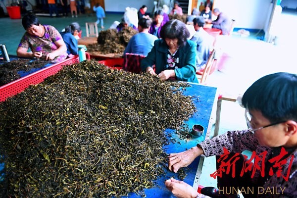 (9月13日,安化县江南镇金田村,村民在扶贫车间加工黑茶。湖南日报记者 徐行 摄)