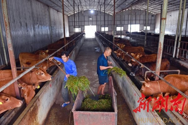 (9月13日,安化县江南镇金田村,工人在黄牛养殖基地给牛喂草料。湖南日报记者 徐行 摄)