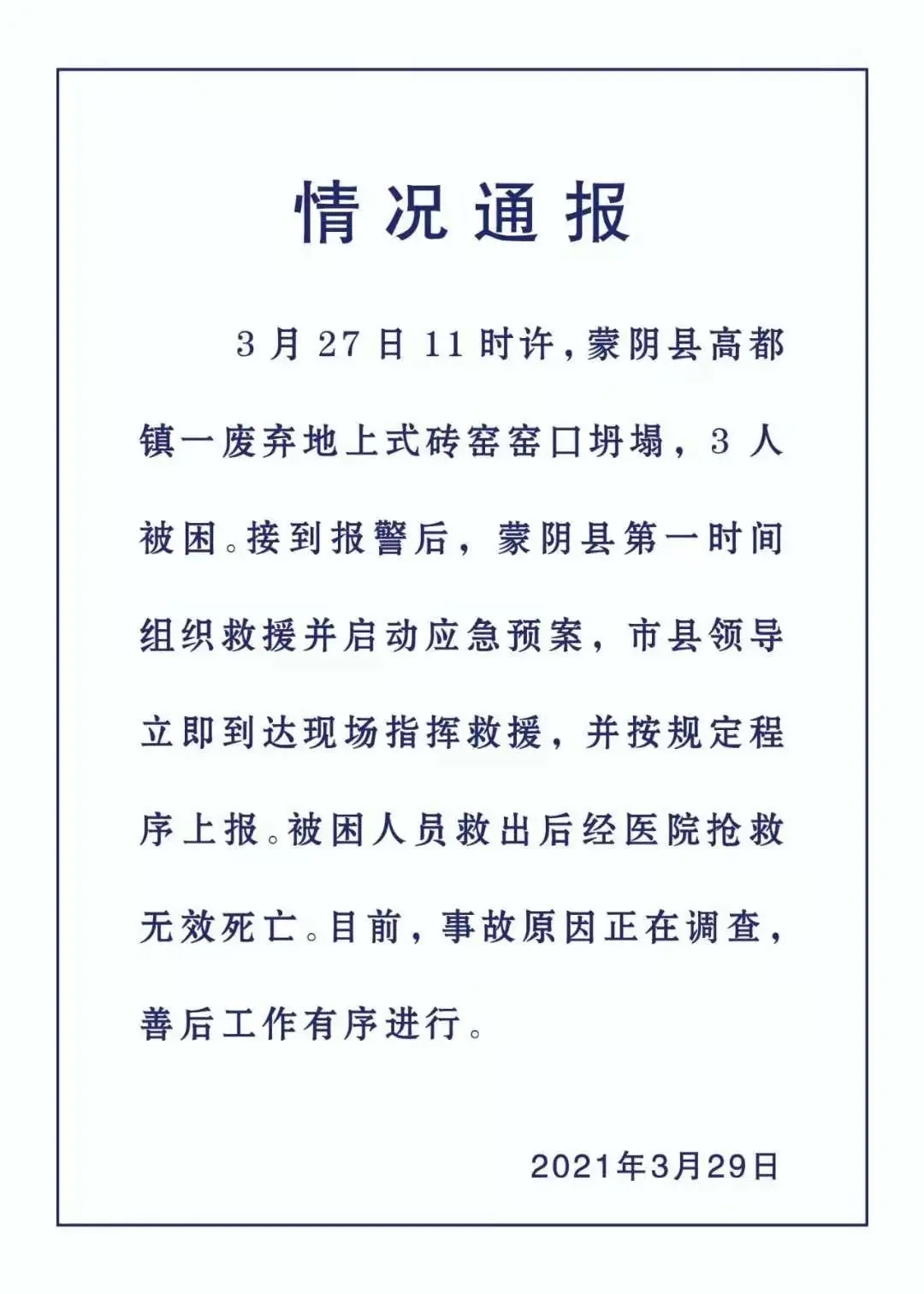 3月29日,记者从山东省蒙阴县公安部门获悉:3月27日11时许,蒙阴县高都镇一废弃地上式砖窑窑口发生坍塌,3人被困。经抢救,3名被困人员救出后经医院抢救无效死亡。