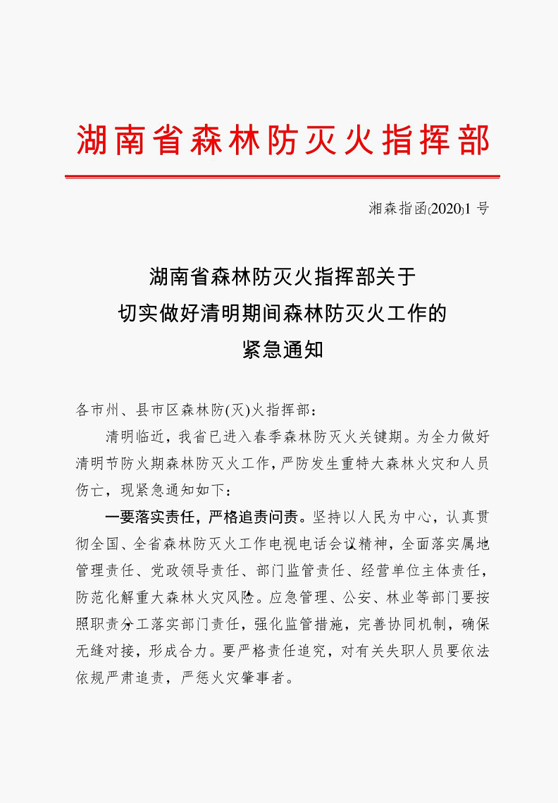 附件:省森林防灭火指挥部《关于切实做好清明节期间森林防灭火工作的紧急通知》(湘森指函〔2020〕1号)