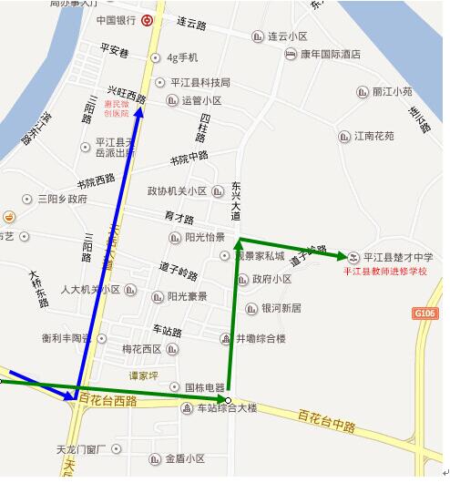 2、指示线路均为由平伍公路(西)进入平江,也可由平汝高速(东)下高速直接进入百花台路; 3、“车站综合大楼”对面为天岳汽车站。
