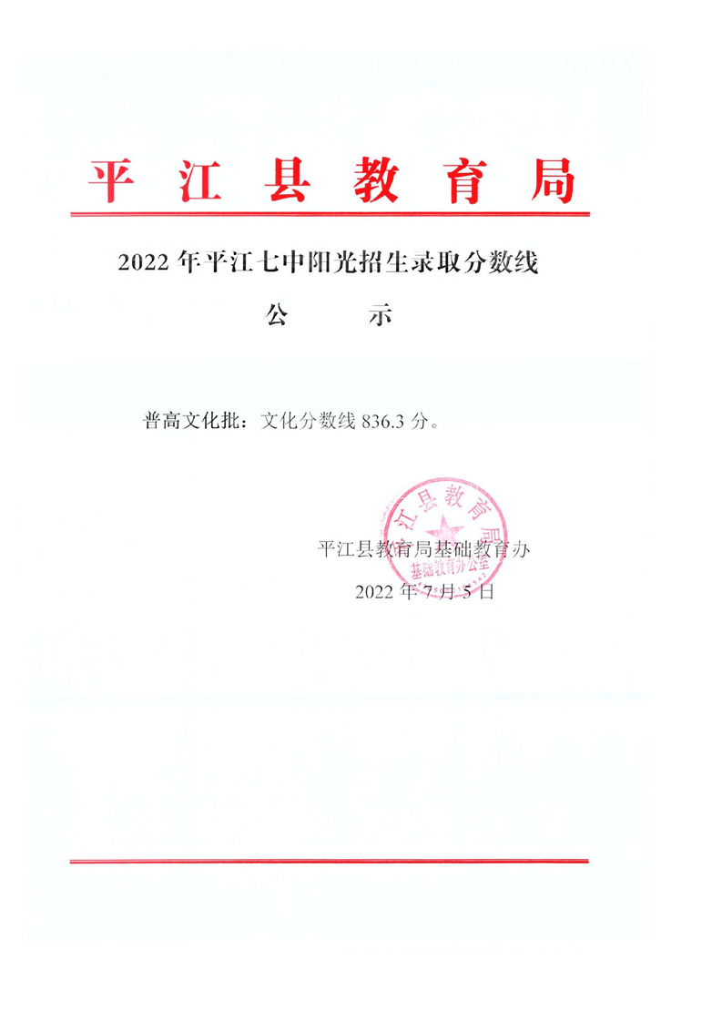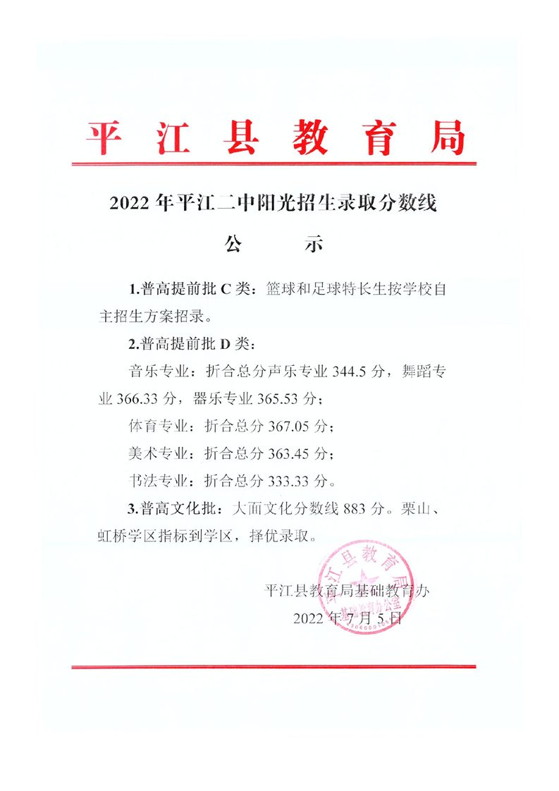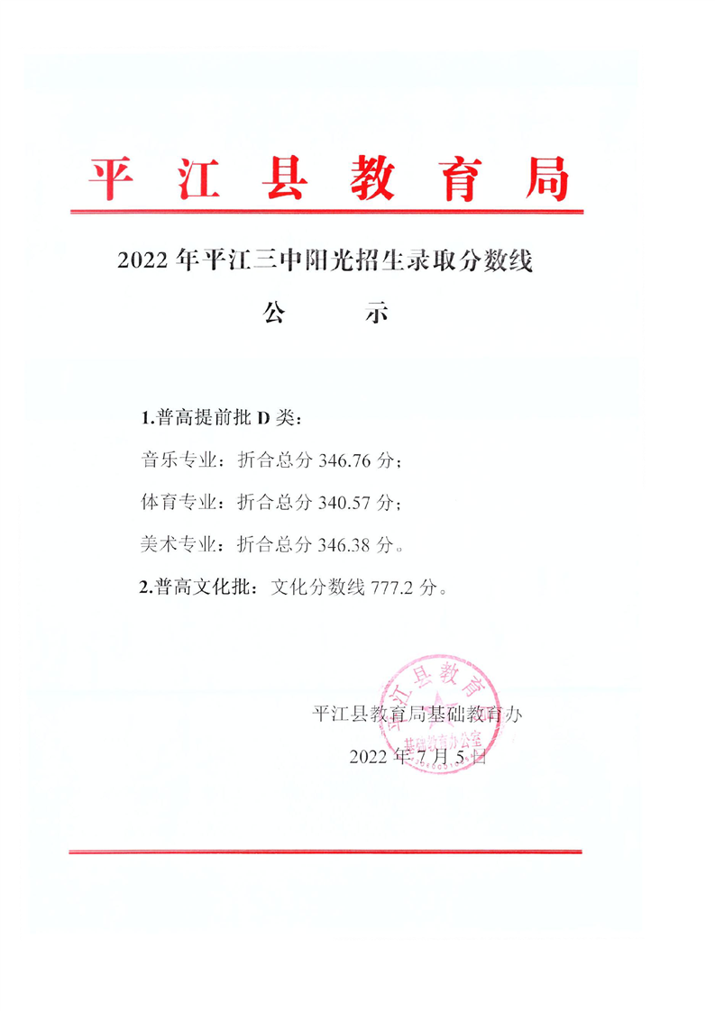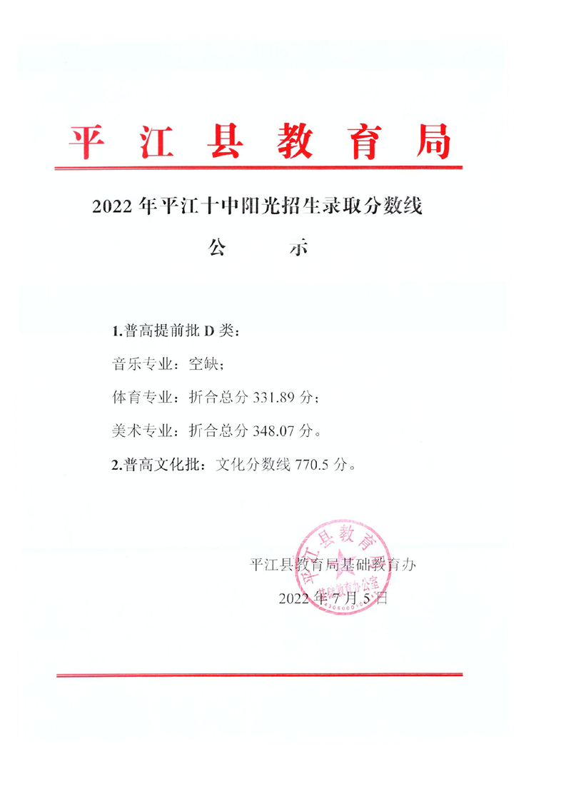2022年平江二中、三中、四中、五中、七中、十中阳光招生录取分数线公示
