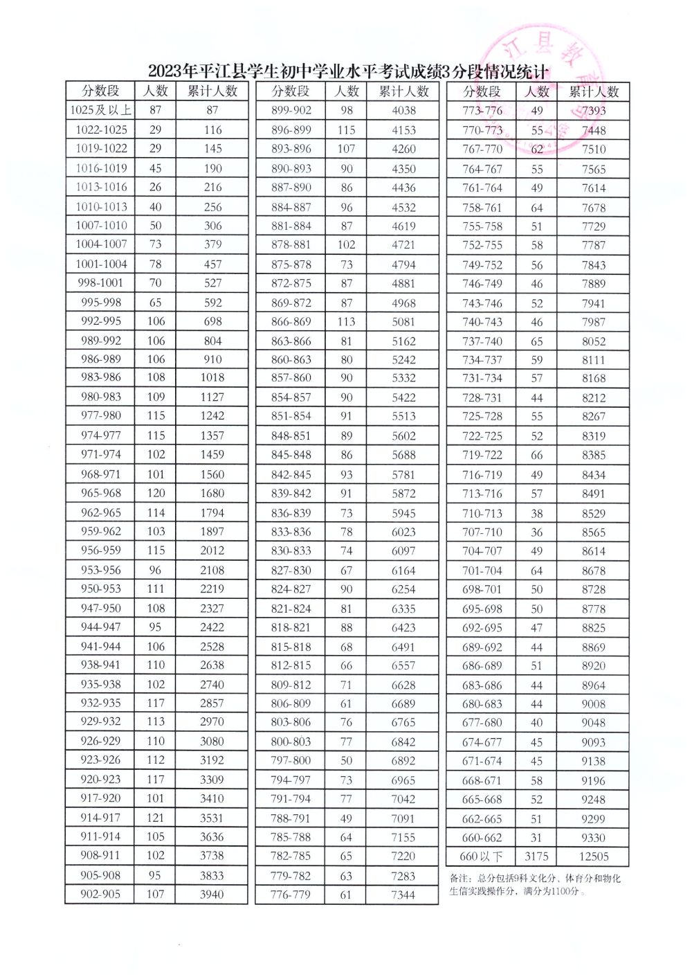 2023年平江县学生初中学业水平考试成绩3分段情况统计