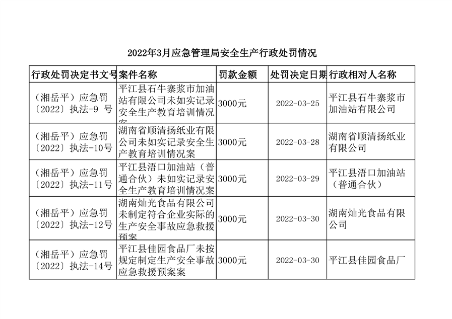 2022年3月应急管理局安全生产行政处罚情况