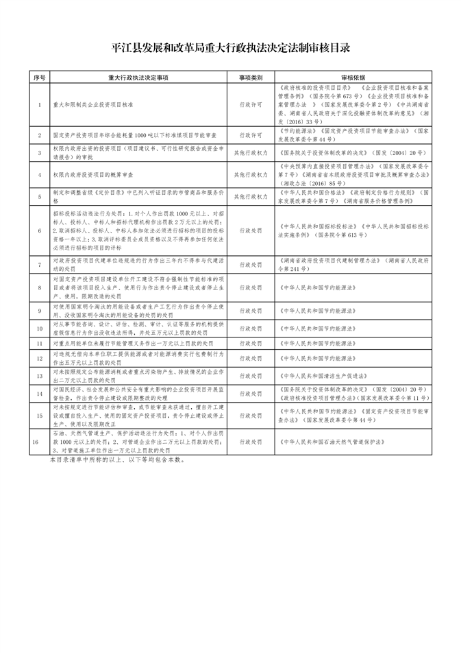 平江县发展和改革局重大行政执法决定法制审核目录(2022)