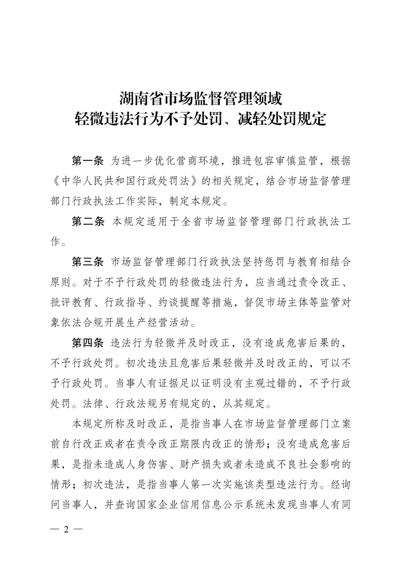 湖南省市场监督管理局关于印发《湖南省市场监督管理领域轻微违法行为不予处罚、减轻处罚规定》的通知
