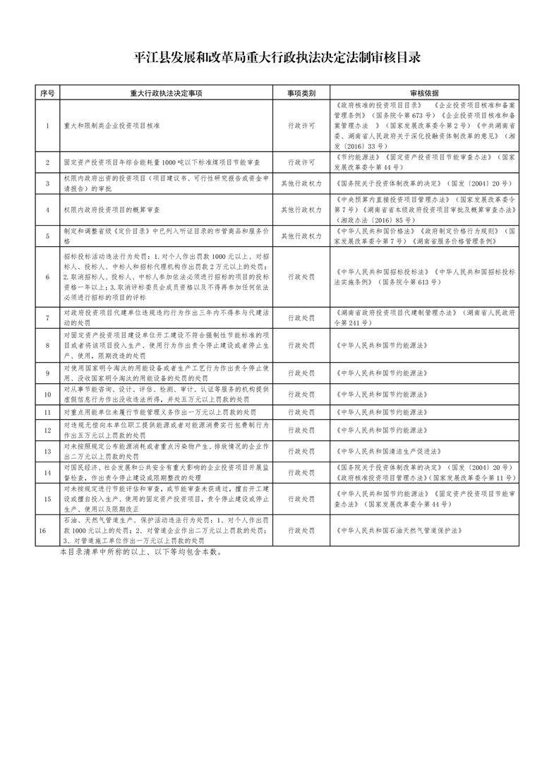 平江县发展和改革局重大行政执法决定法制审核目录