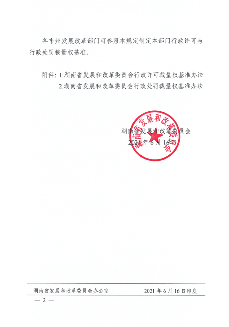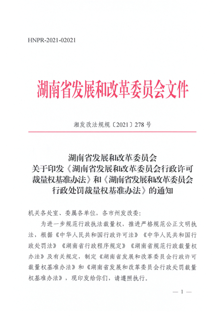 湘发改法规规〔2021〕278号 关于印发《湖南省发展和改革委员会行政许可裁量权基准办法》和《湖南省发展和改革委员会行政处罚裁量权基准办法》的通知