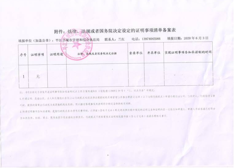 平江县城市管理和综合执法局法律、法规或者国务院决定设定的证明事项清单备案表