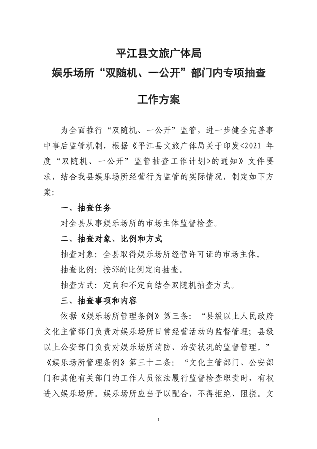平江县文化旅游广电体育局娱乐场所“双随机、一公开”部门内专项抽查工作方案