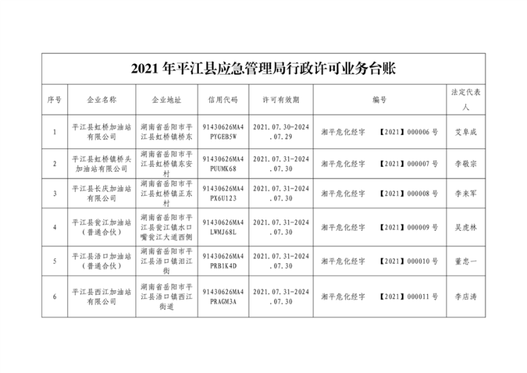 2021年县应急管理局行政许可台账