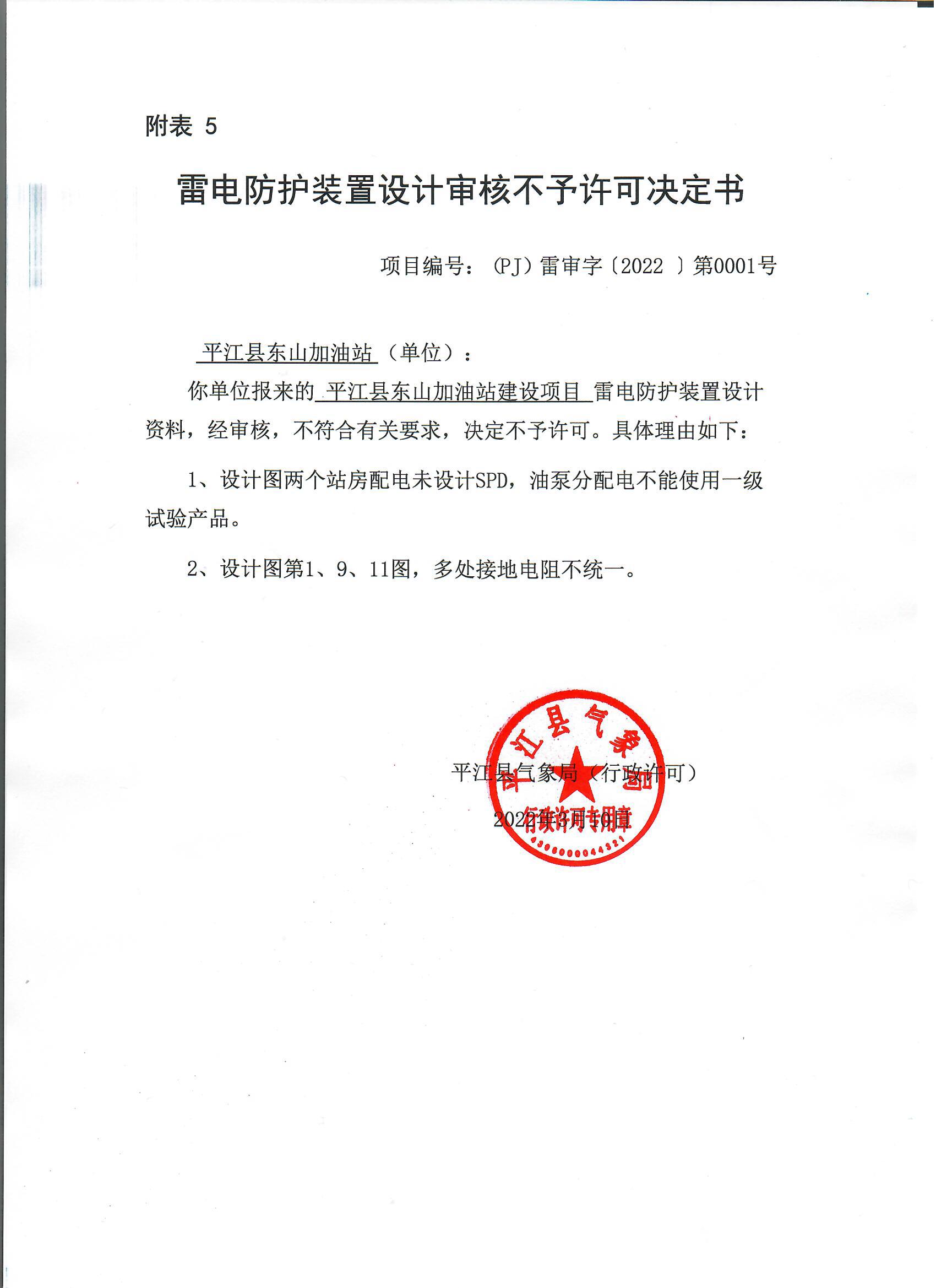 东山加油站东山加油站雷电防护装置设计审核不予许可决定书