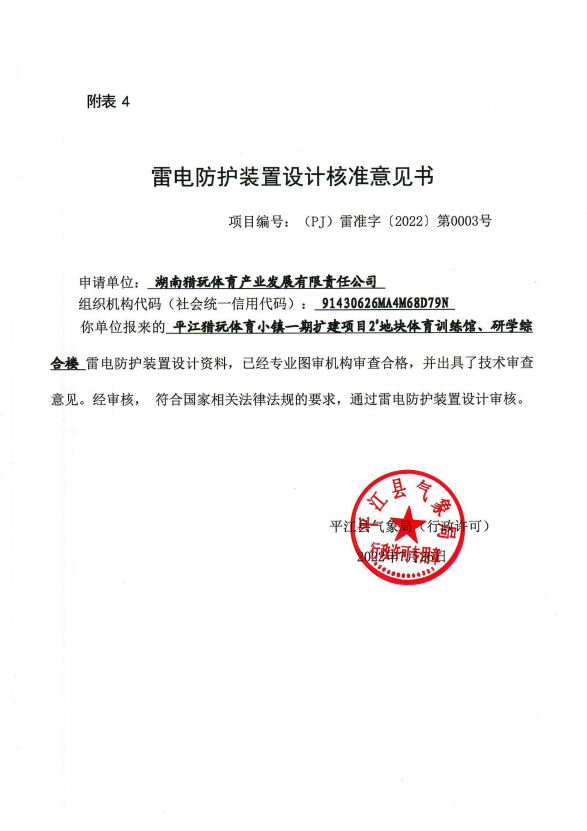 猎玩体育小镇2#地块雷电防护装置设计核准意见书