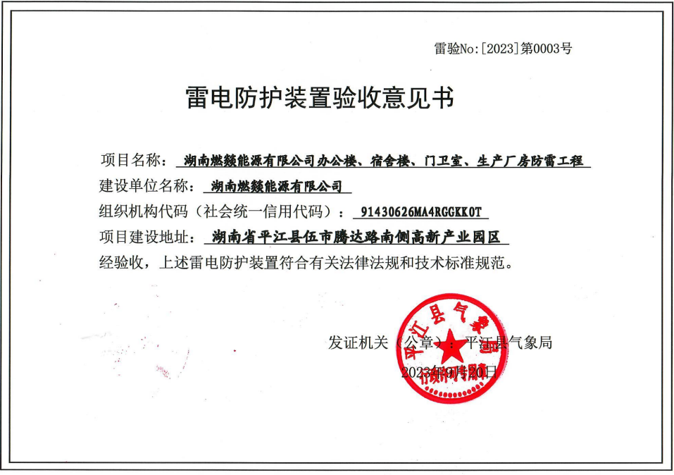 燃燚能源雷电防护装置雷电防护装置验收意见书(办公楼、宿舍楼、门卫室、生产厂房防雷工程)