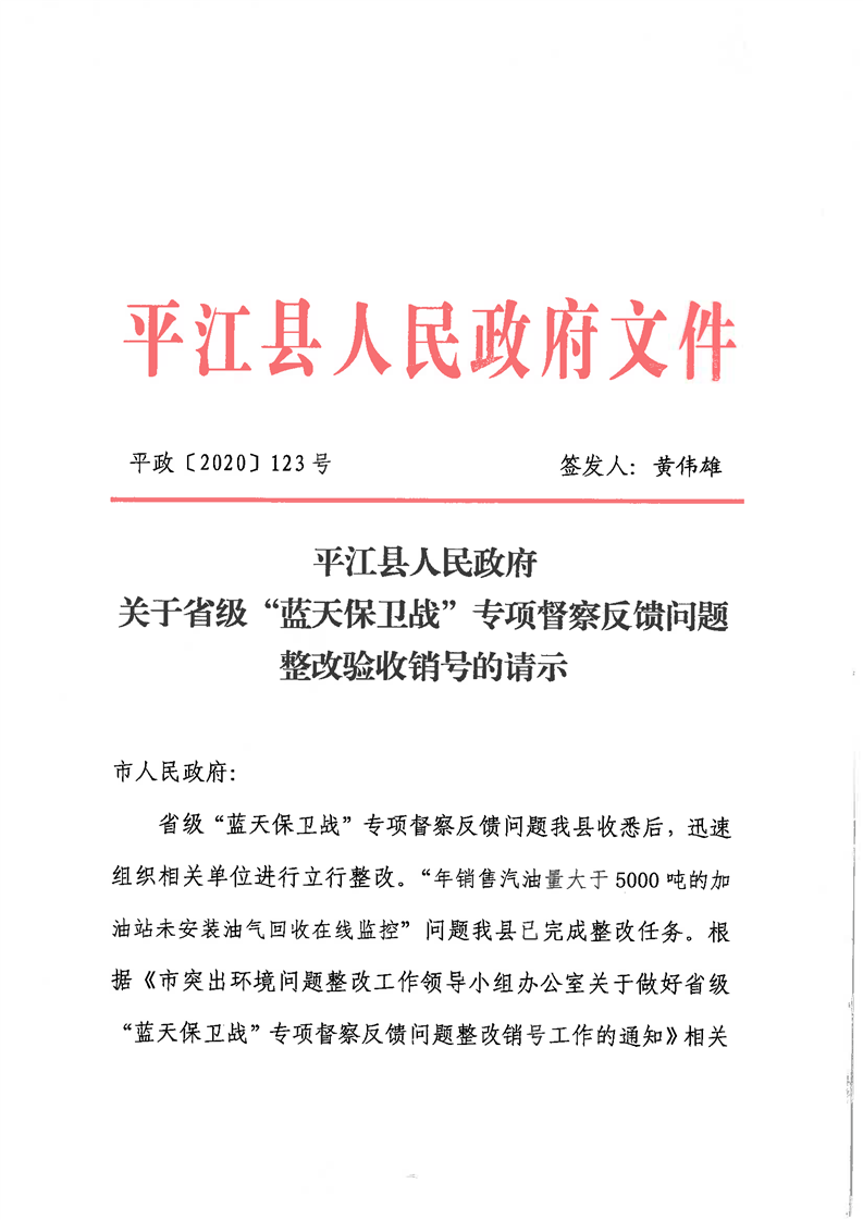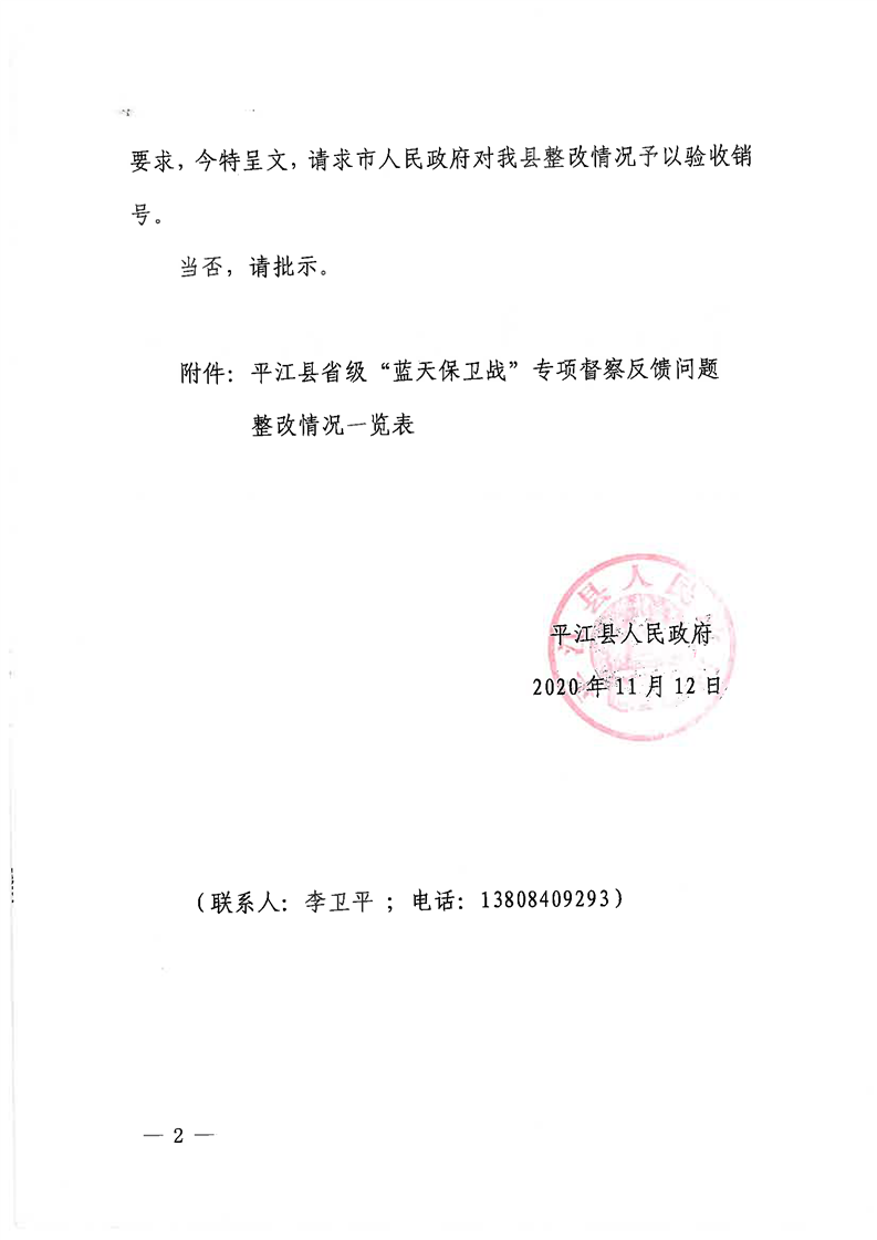 平江县人民政府关于省级“蓝天保卫战”专项督察反馈问题整改验收销号的请示